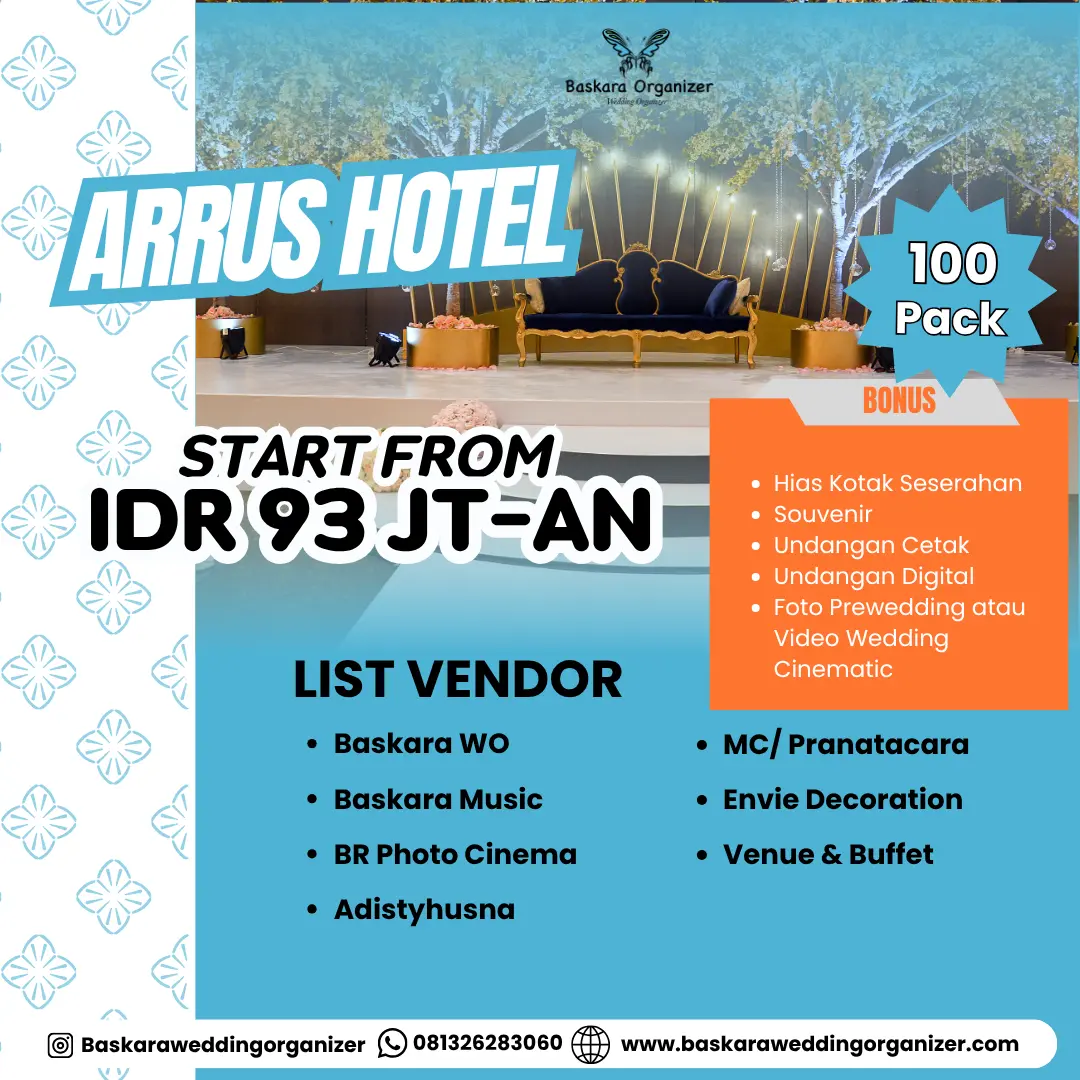 Untuk kamu yang ingin melangsungkan pernikahan di Hotel Arus, Baskara WO menghadirkan Wedding Package yang cocok untukmu. Sebab, paket wedding yang kami sediakan telah include dengan berbagai vendor pendukung seperti foto & dokumentasi wedding, MUA (Make Up Artist), Dekorasi, serta Hiburan.