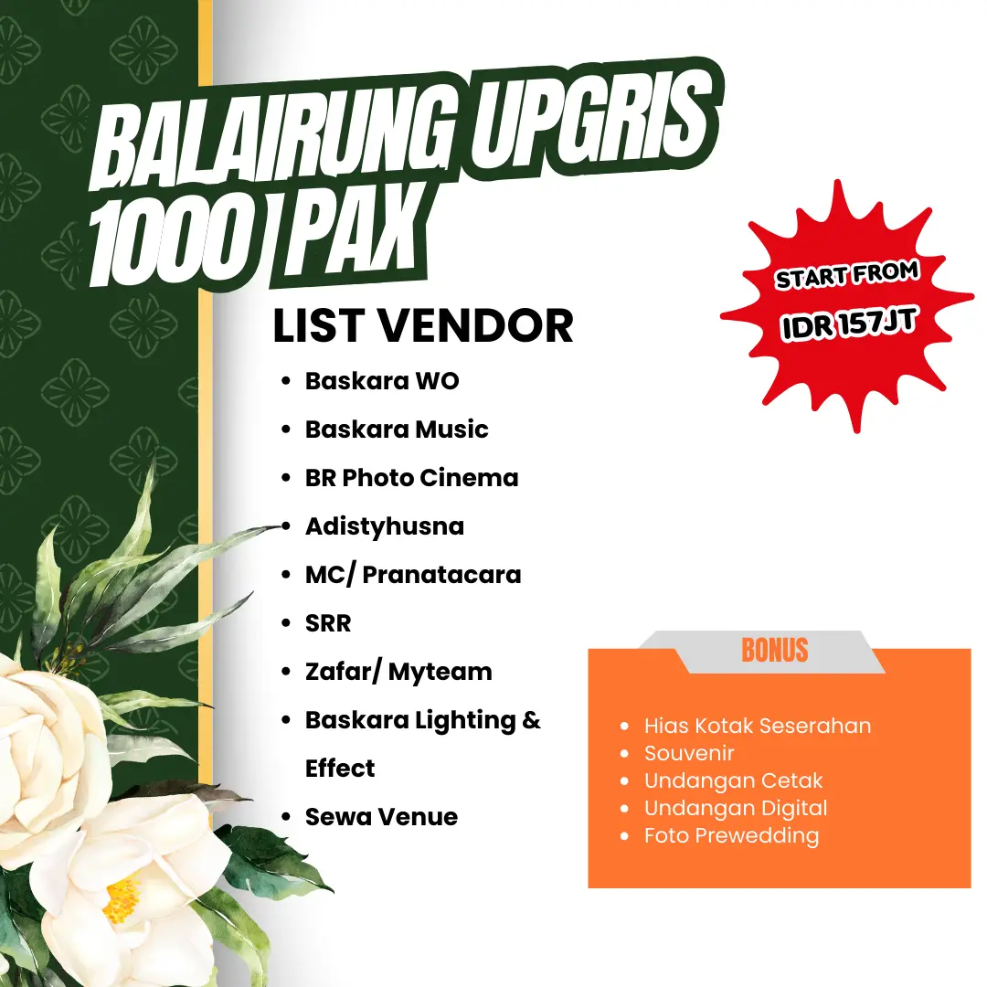 Bagi pasangan yang tidak ingin direpotkan dengan perencanaan pernikahan, pasangan dapat mengunakan layanan dari Baskara Wedding Organizer untuk menikah di Balirung UPGRIS Semarang.
