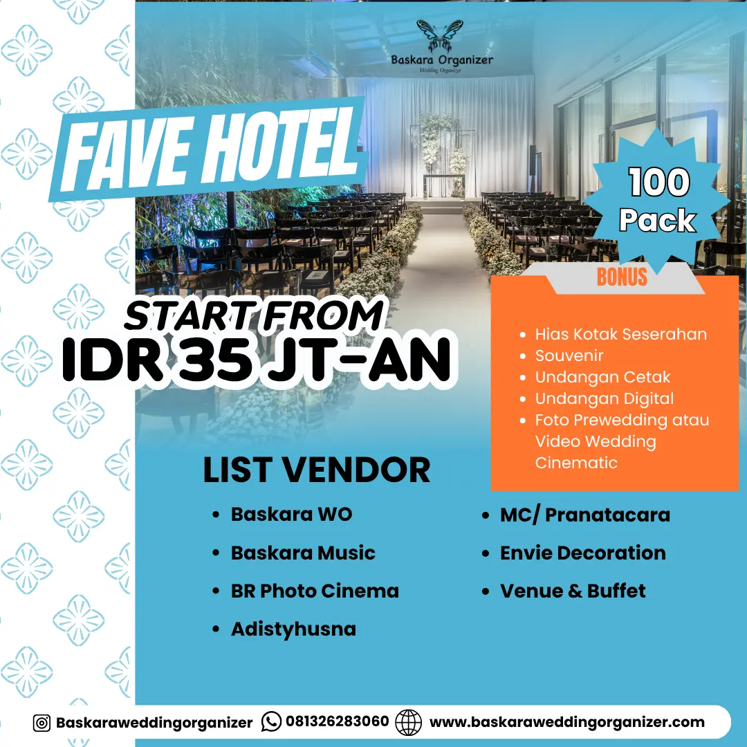 Ingin merasakan fasilitas nikah di hotel dengan biaya terjangkau?. Baskara WO menghadirkan Fave Hotel Wedding Package yang terlengkap. Sebab, paket nikah ini telah termasuk dengan beragam vendor seperti foto & video dokumentasi, entertaiment, tata rias, dekorasi, serta MC.