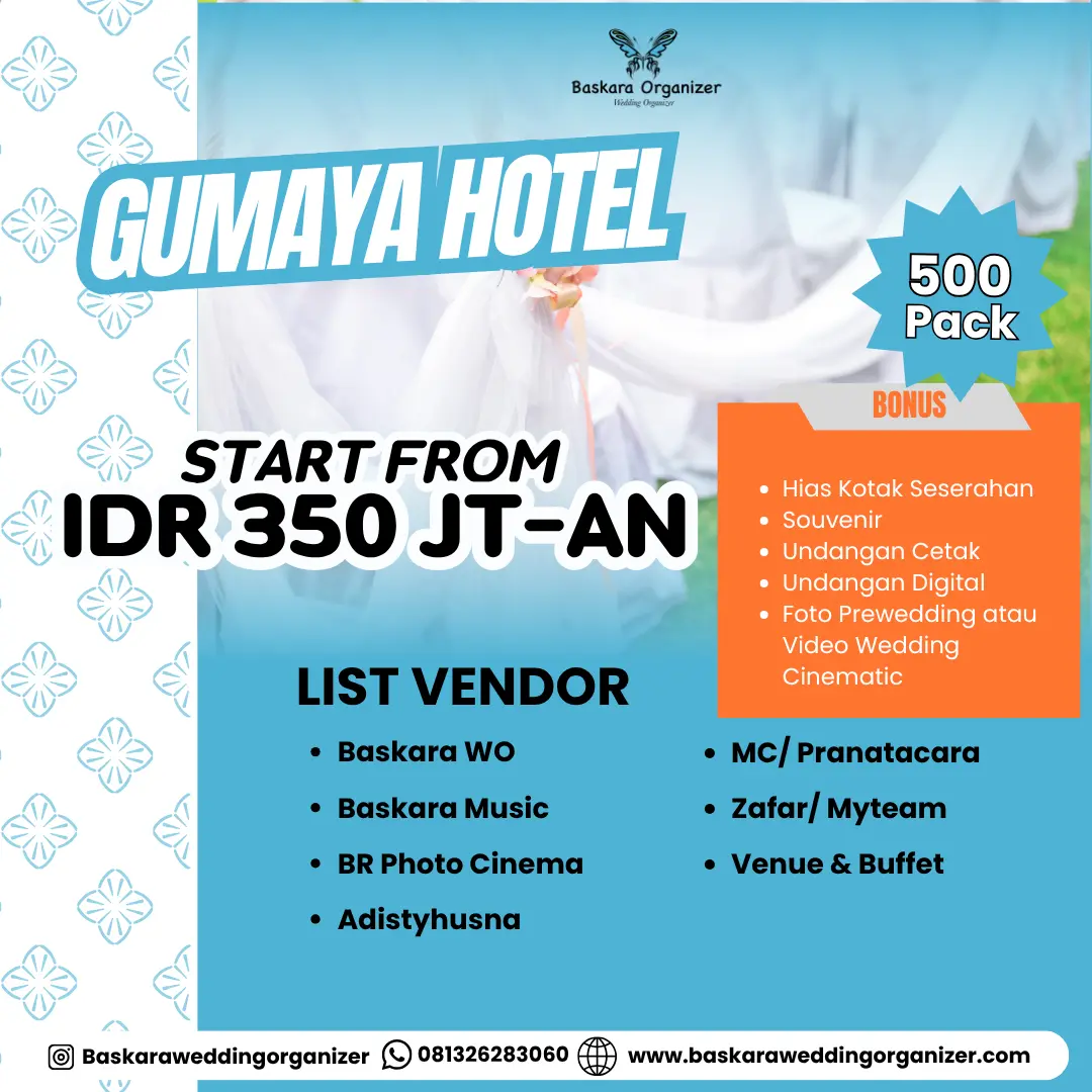 Agar pernikahan kamu dapat berjalan dengan sempurna, Baskara WO menghadirkan Gumaya Hotel Wedding Package dengan harga yang lebih terjangkau. Sebab, paket pernikahan yang kami tawarkan telah termasuk dengan beragam vendor seperti foto & video wedding dokumentasi, dekorasi, catering, hingga MUA (Tata Rias).