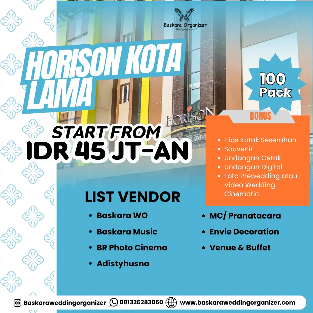 Agar pesta pernikahanmu dapat berjalan dengan lancar, Baskara WO menawarkan Horison Kota Lama Wedding Package dengan harga yang terjangkau. Paket nikah yang ditawarkan telah termasuk dengan beragam vendor seperti foto & video dokumentasi, tatarias, dekorasi, serta Entertaiment.